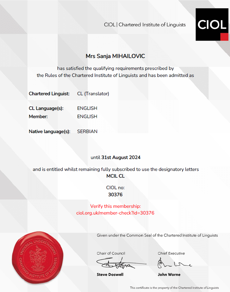 CIOL DipTrans MCIL, Science and Technology, Chartered Institute of Linguists, UK (EN > SR)